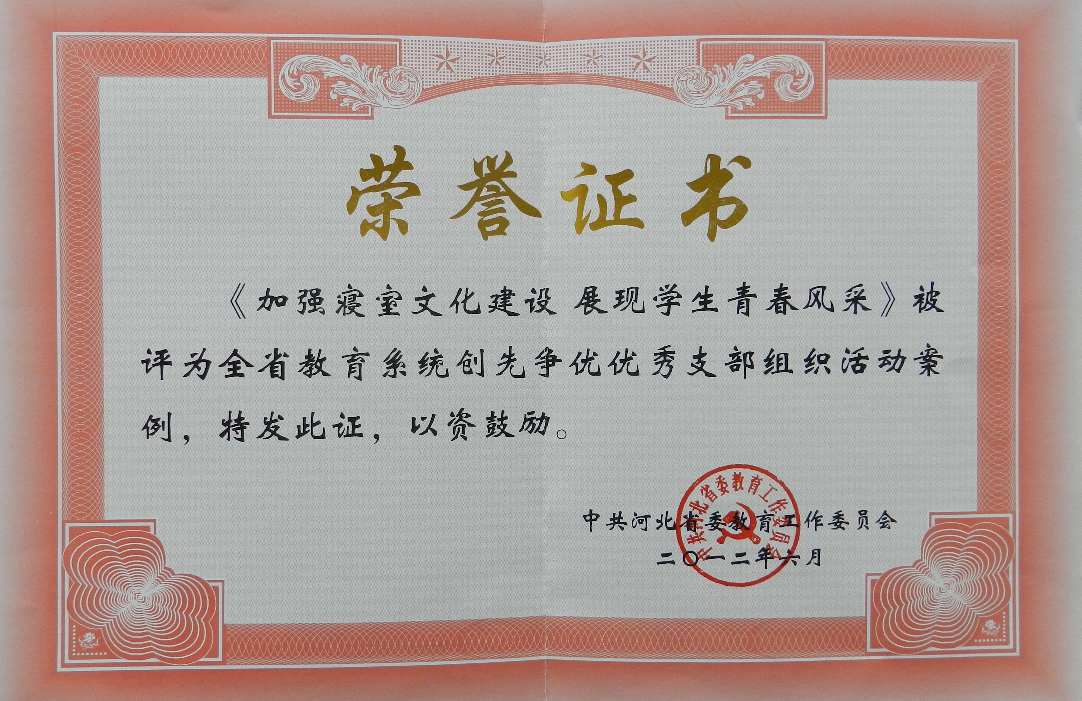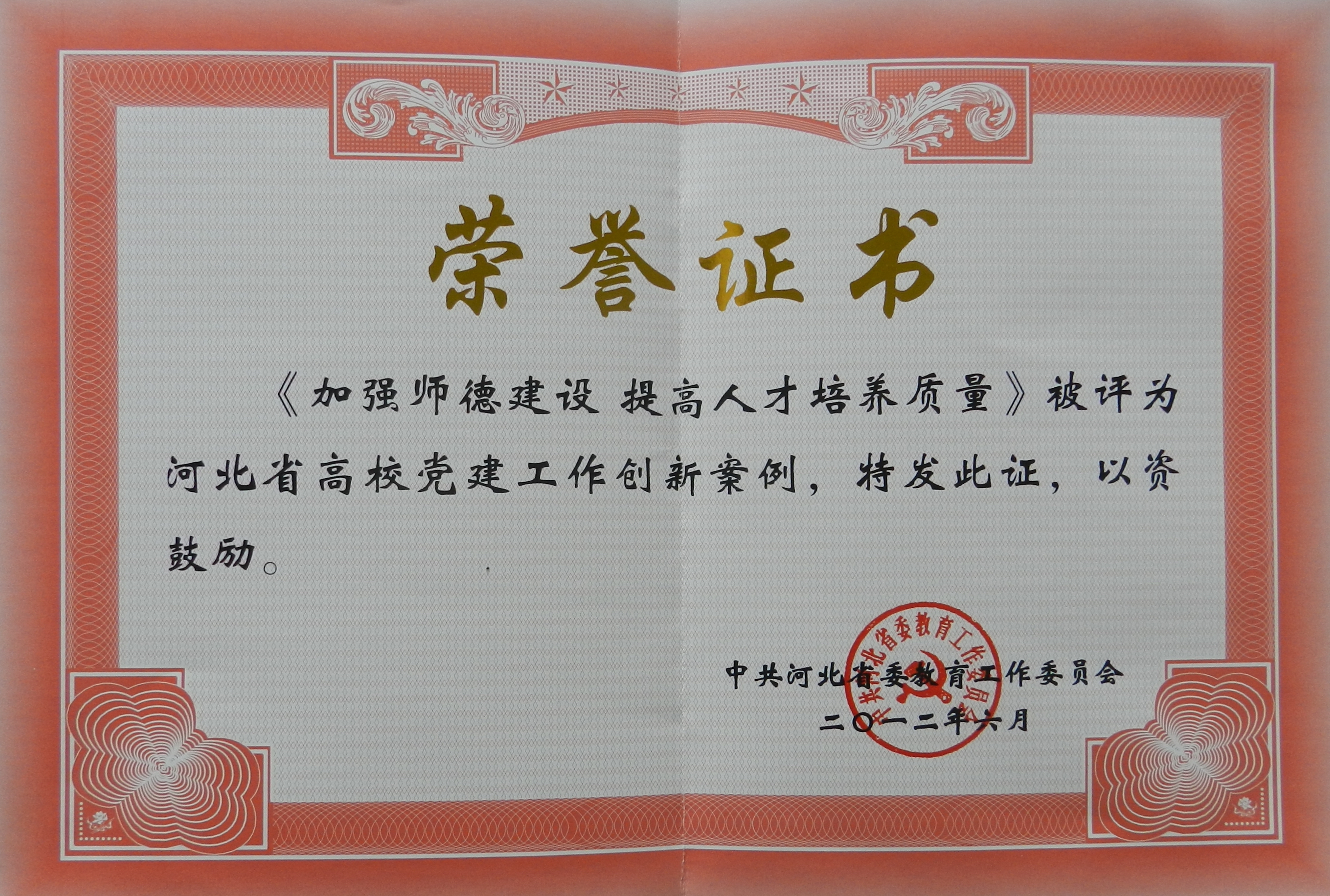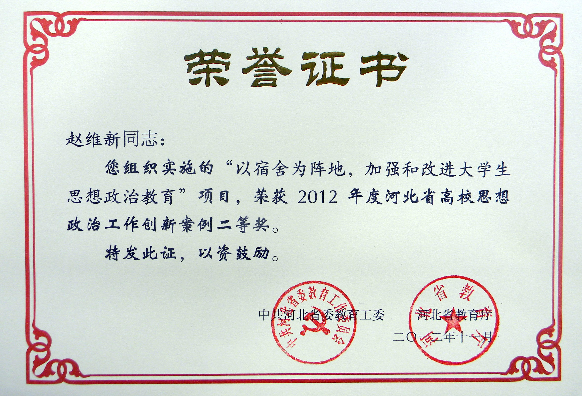 由学院党委副书记、副院长赵维新组织实施的“以宿舍为阵地,加强和改进大学生思想政治教育”项目,荣获2012年度河北省高校思想政治工作创新案例二等奖。 图为获奖证书[详细]