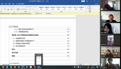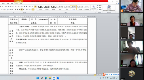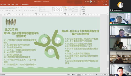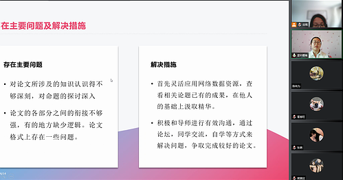 检查过程中,2022届毕业生逐一介绍了毕业论文完成情况,展示了论文选题、架构和基本内容。检查组教师对提交的论文逐一进行了点评,对共性问题做了规范指导,对个性问题做了探讨交流。学院督导组线上巡视了检查现场。