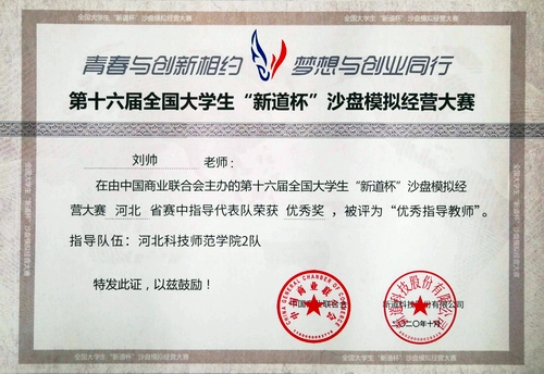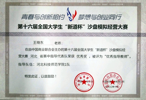 2020年10月30日,由中国商业联合会主办,河北省教育厅指导,河北省高等教育学会实验室工作分会协办,衡水学院承办,新道科技股份有限公司提供技术支持的第十六届全国大学生“新道杯”沙盘模拟经营大赛河北省赛以线上形式在衡水学院举行。经过协力拼搏,我院由关莹莹、张震、靳春、张家淇、张林浩组成的校代表队1队和由郝岩、董鹏媛、陈诗雨、刘杨帆、蒋涛组成的校代表队2队均获优秀奖。我院教师刘帅、王晓东获评优秀指导教师。(编审:王志安)
