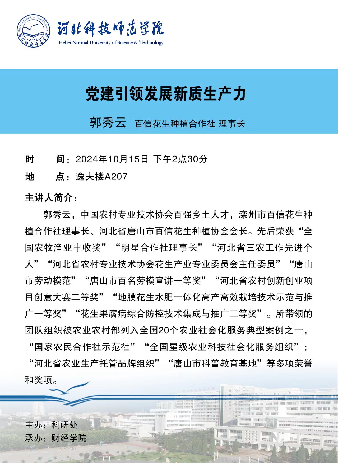 金沙检测线路js95拟于2024年10月15日下午14:30组织学术报告讲座《党建引领发展新质生产力》,主讲人:郭秀云。
