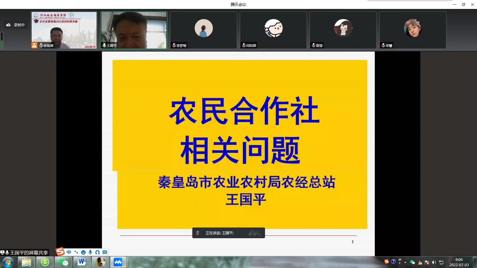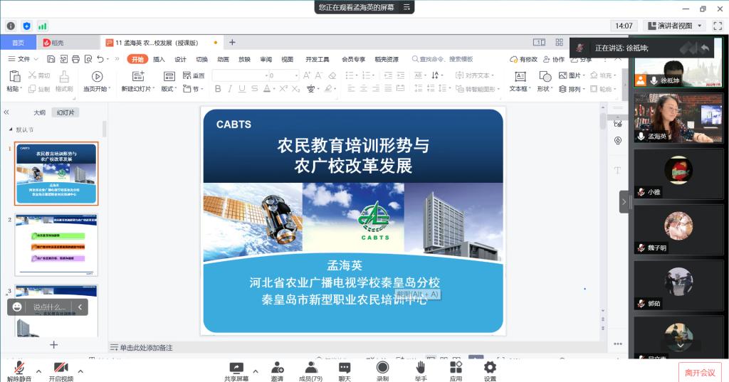 四场讲座均以腾讯会议形式举行,孙芳老师为师生们解读了现代农业经济理论与政策;于磊老师为师生们讲授了巩固拓展脱贫攻坚成果衔接推进乡村振兴战的重大意义和路径选择;王国平老师为师生们辨析了农民合作社的概念、本质和实践等问题;孟海英老师介绍了我国农民教育培训形势与农广校的改革发展与实践等问题。
