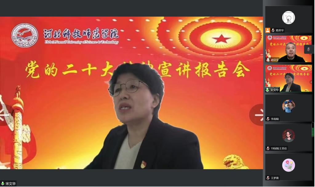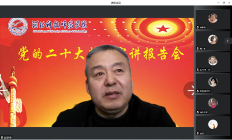 2022年12月19日下午2点,校思想政治理论教育宣讲团成员、党委宣传部部长赵宗宝莅临我院开展党的二十大精神宣讲会,学院全体教师、学生预备党员共计120余人齐聚云端聆听讲座,学院党委书记宋文华主持本次会议。