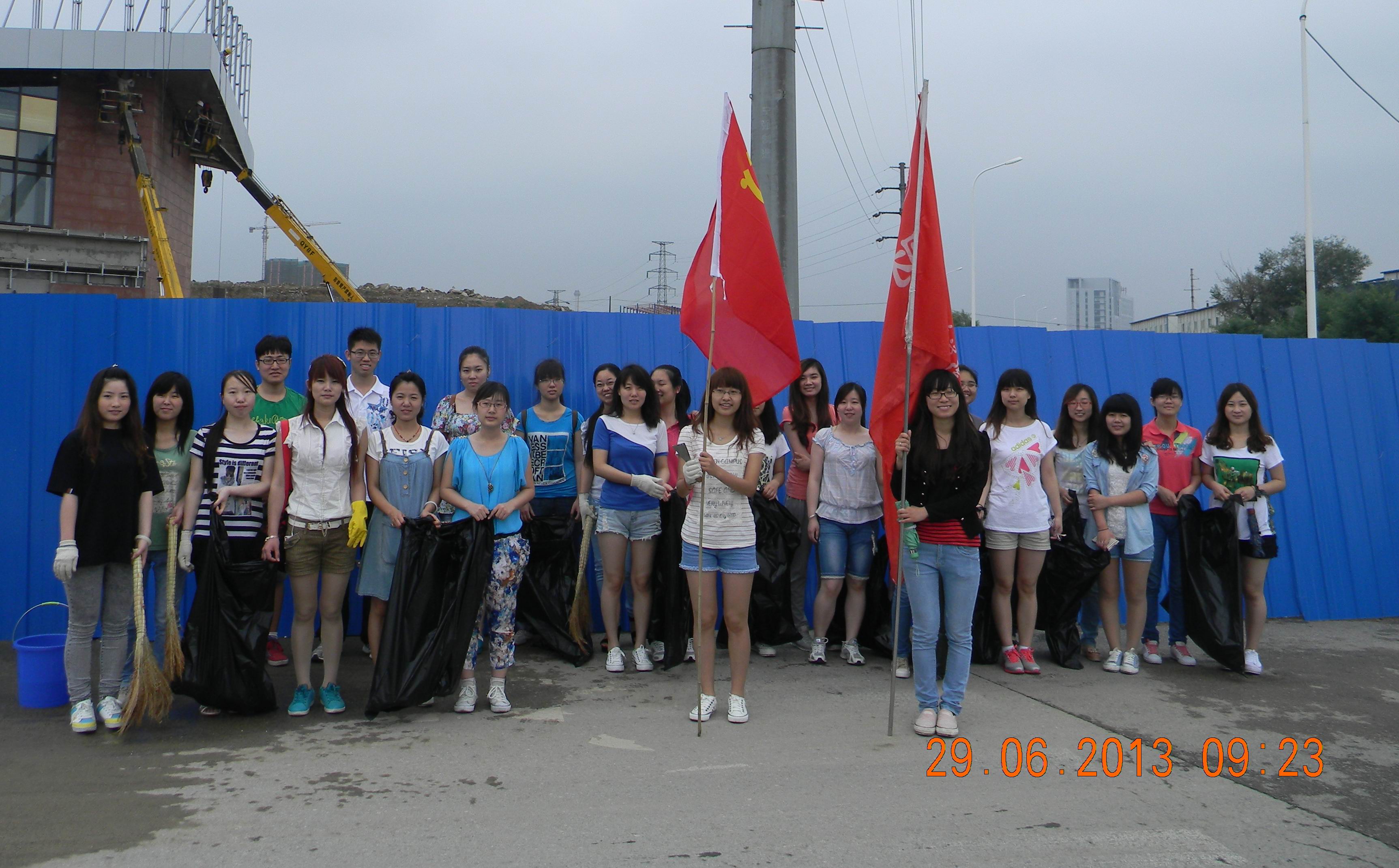 为了响应上级号召,2013年七一前夕,学院组织学生党员、积极分子进行义务劳动,沿街道捡拾人行道上的白色垃圾、清洁广告栏。