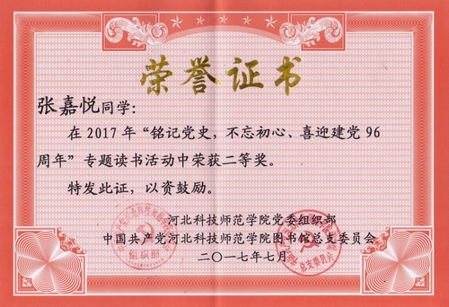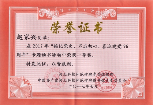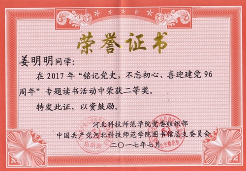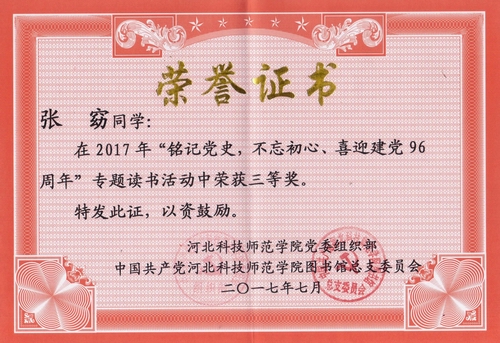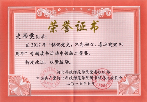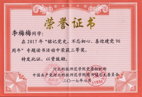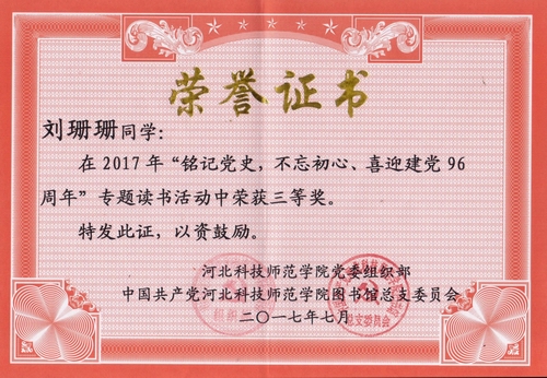 经过评选,张窈、祝润、苑星星、杨思维、彭雅丽、苏丽娜、苗梦璇、李梅梅、张一楠9名同学被学院党委评为优秀党员,赵家兴、王少会、杨楠、颜灵敏、李雯、陈雨、豆建荣、万帅、杨晴、刘文惠、刘珊珊、刘雅琨、武倩倩、张可萏、关雯旭、赵艳玲、杨然17名学生被评为优秀积极分子;在“铭记党史,不忘初心、喜迎建党96周年”专题读书活动中,赵家兴获得校一等奖,史蒂文、姜明明、张嘉悦获得校二等奖,李梅梅、张窈、刘珊珊获得校三等奖。(编审:李宝文)