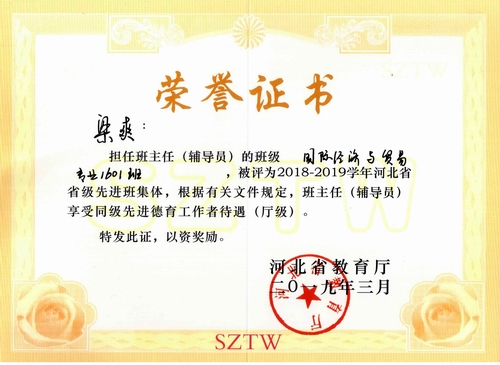 图为辅导员梁爽省级先进德育工作者荣誉证书