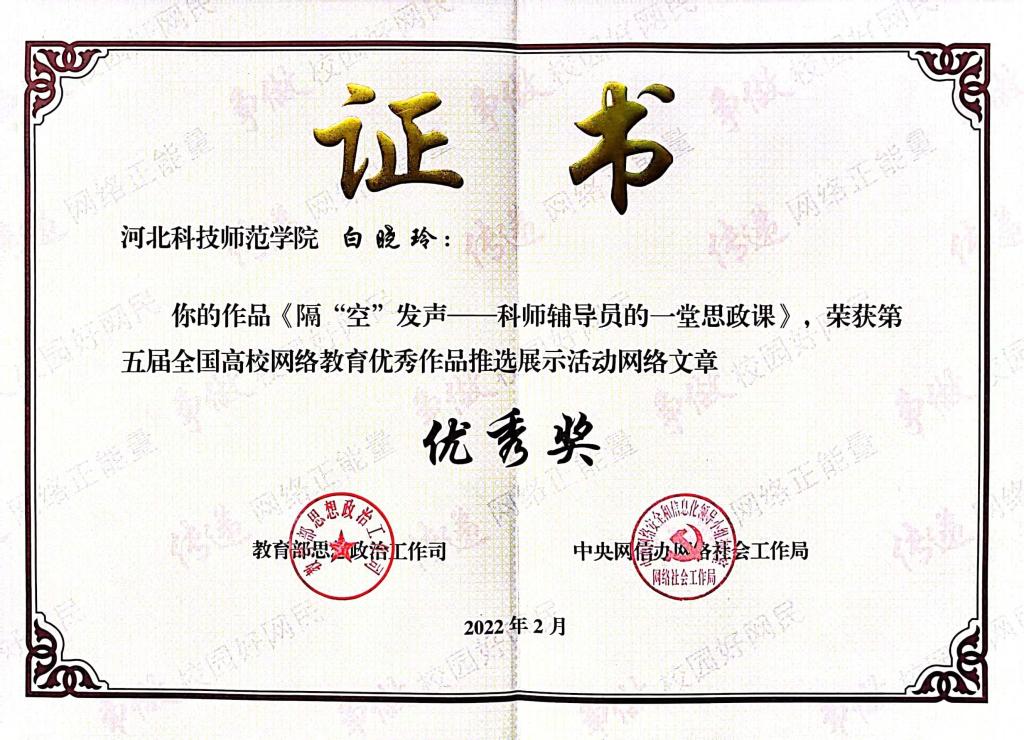 在教育部思想政治工作司、中央网信办网络社会工作局举办的第五届全国大学生网络文化节和全国高校网络教育优秀作品推选展示活动中,白晓玲老师的网络文章《隔“空”发声——科师辅导员的一堂思政课》获得优秀奖。