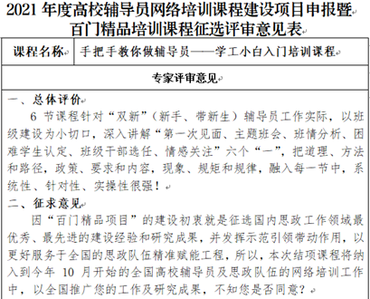 近日,2021年度立项的“高校辅导员网络培训百门精品课程建设项目”首批结项名单公示,经过教育部专家三轮评审和集中评议,有39个项目率先通过专家验收,学院副处级辅导员白晓玲老师主持的《手把手教你做辅导员——学工小白入门培训课程》名列其中。