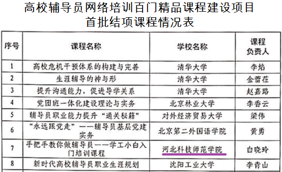 图为高校辅导员网络培训百门精品课程建设项目首批结项课程情况表