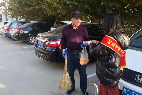 中午,他们向在校园里辛勤工作的环卫工人送上一杯热水和一份新鲜的水果以表达敬意。下午,他们手持自制的以“环保在身边”为主题的宣传单,在教学楼、食堂和师生交流,呼吁节约用水、节约用电、珍惜纸张、节约粮食、垃圾分类,关注身边环保,倡导绿色消费,共建绿色校园。他们的做法得到环卫工人的真诚感谢,他们的主张得到师生广泛认同。