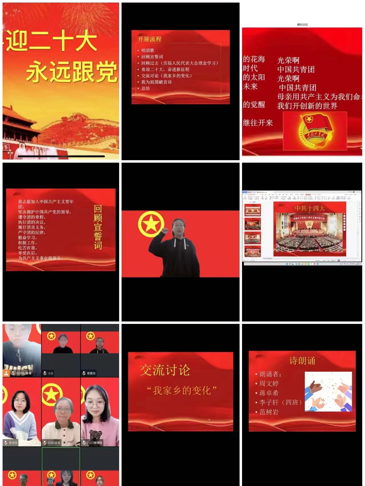 活动伊始,为使同学们尽快融入活动氛围,激发起同学们爱党情怀,团支部开展了以下四个环节,环节一:主持人致词后全体起立,奏唱团歌。环节二:同学们随班长一起回顾入团宣誓词。穿越血与火的历史烽烟,历经建设与改革的风雨洗礼,中国共产党始终带领中国人民创造美好未来。环节三:由班委向大家简述百年党史,提前了解中共二十大。环节四:各家乡代表向同学们展示家乡的变化。大家的家乡越变越好,向着我们所向往的那个目标进发。最后,四名同学以诗朗诵的方式来表达对国家的热爱之情。