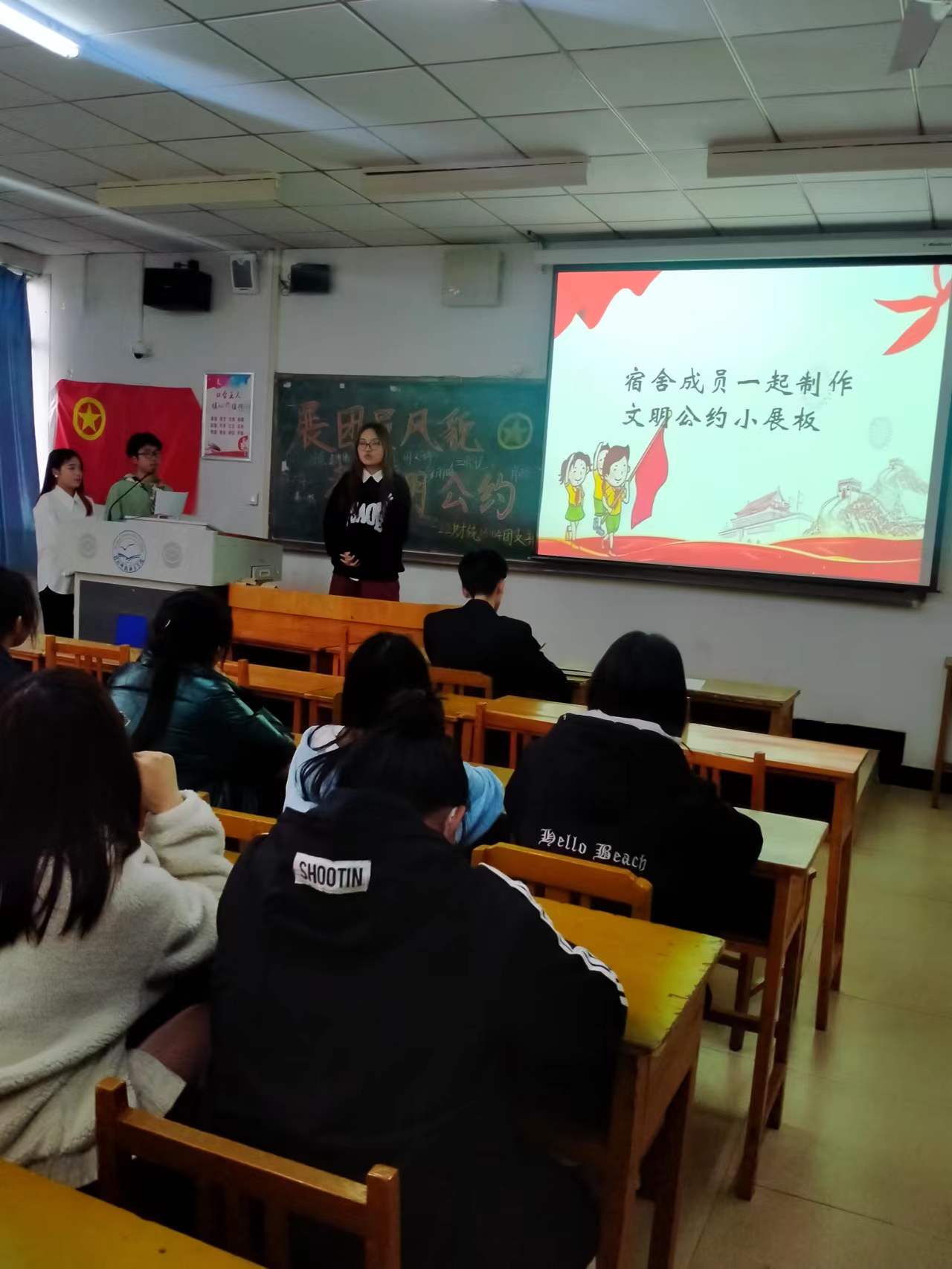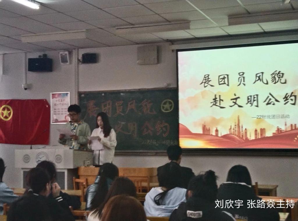 财统220304班团支部于2023年3月28日开展“展团员风貌,赴文明公约”主题精品团日活动,通过前期调研和全体团员共同研讨,团支部围绕学习、纪律、礼仪等方面设立了十条团员文明公约。(编审:王志安)