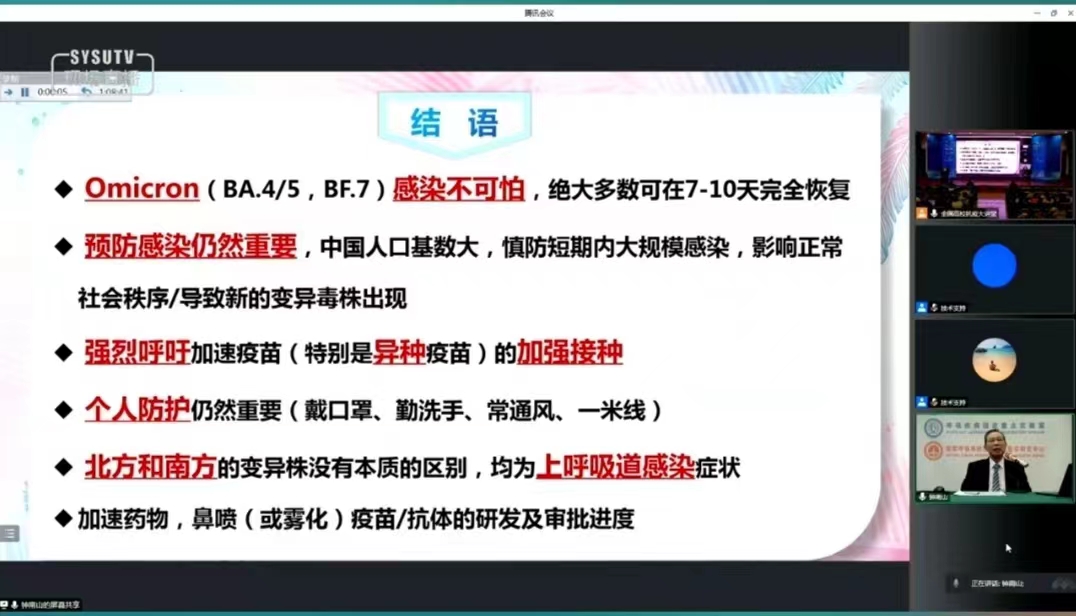 钟南山院士对国家两年多来抗疫取得的成就进行了总结,对全国范围第二波奥密克戎疫情的特点进行分析,对奥密克戎的生物学特征、致病性进行了介绍,并对大学生如何在校园内加强个人防护进行了讲解。通过收看讲座,同学们深刻认识到感染奥秘克戎并不可怕,但预防感染仍然要重视,疫苗接种要做到应接尽接。(编审:王志安)