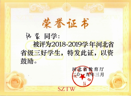 图为国贸1601班辅导员梁爽省级先进德育工作者荣誉证书