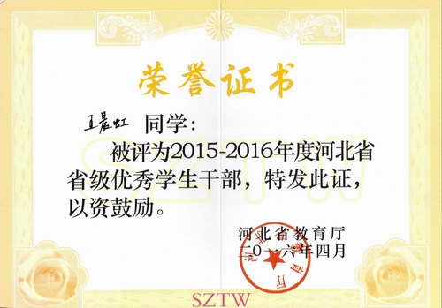 图为王晨虹省优秀学生干部荣誉证书