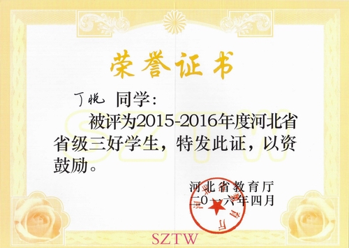 图为丁悦省三好学生荣誉证书