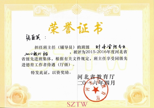 图为张丽英省先进德育工作者荣誉证书