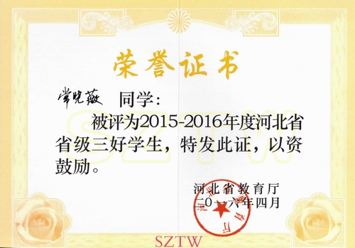 图为常晓薇省三好学生荣誉证书