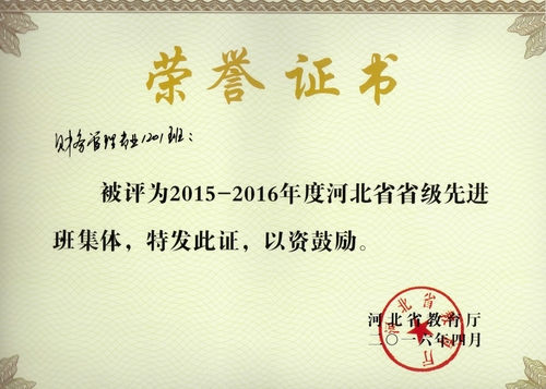 图为财务管理专业1201班省先进班集体荣誉证书
