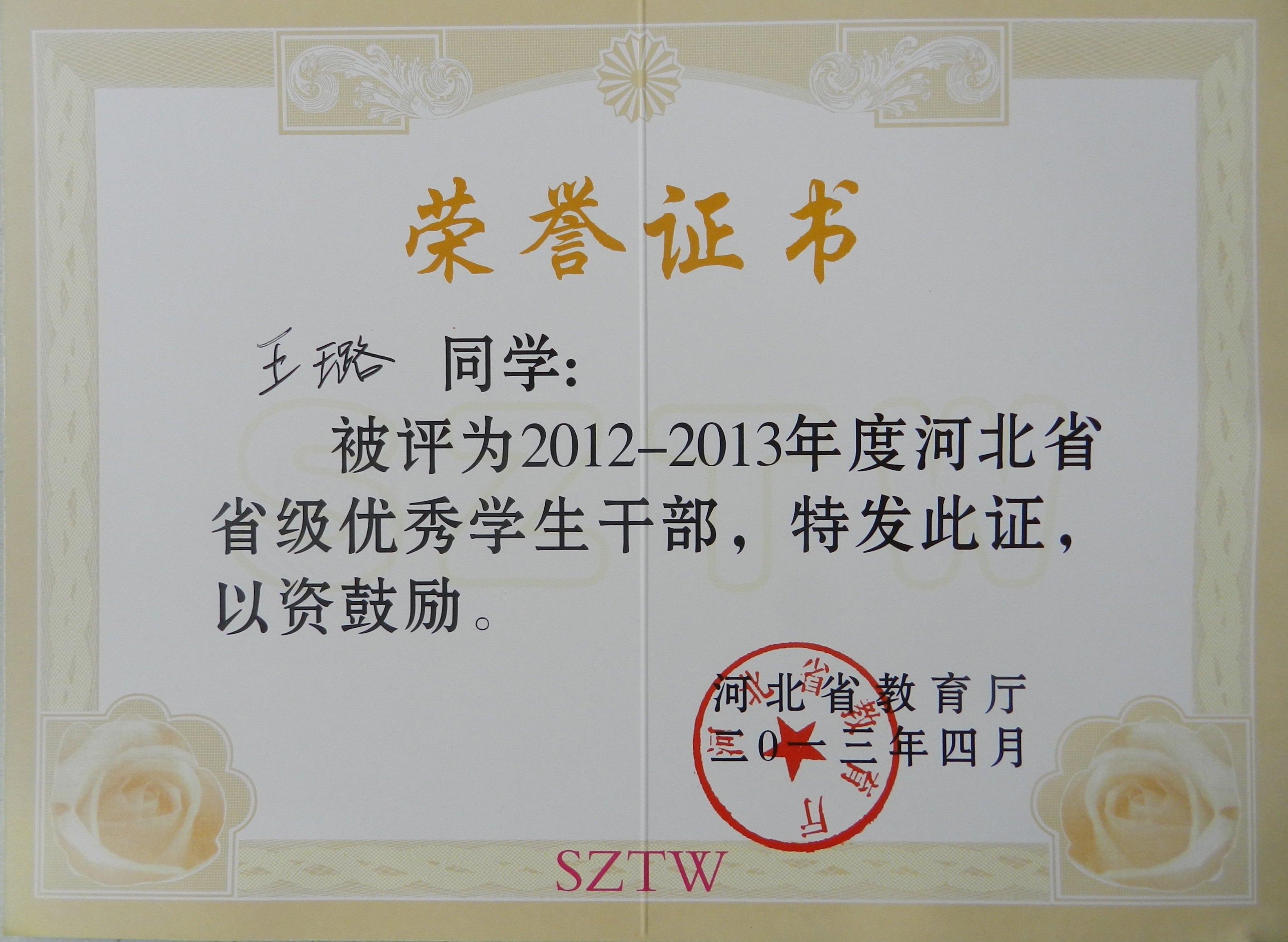 我院王璐同学荣获河北省教育厅2012-2013年度优秀学生干部荣誉。