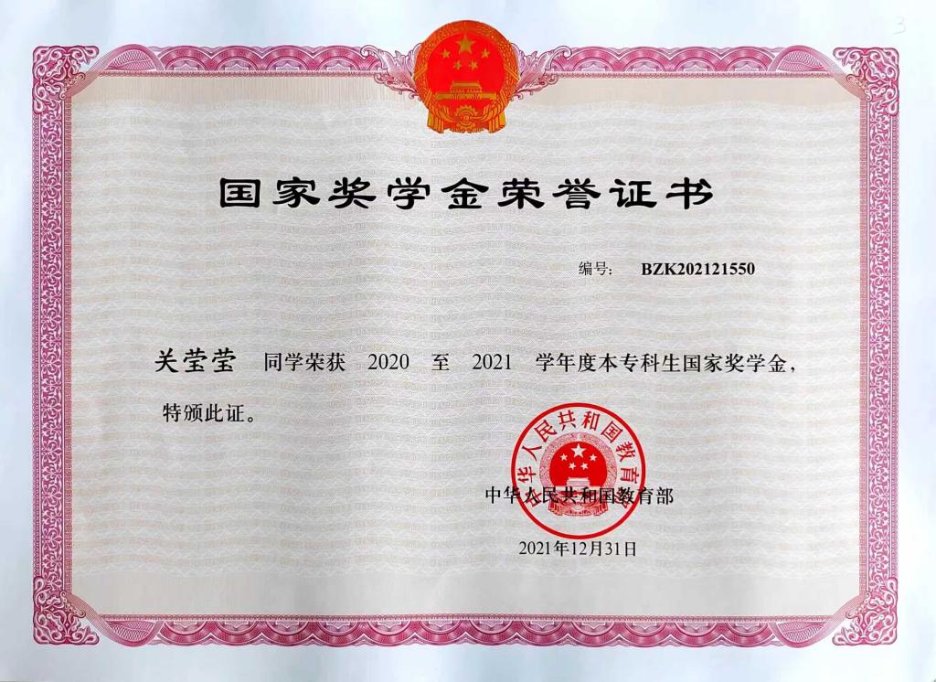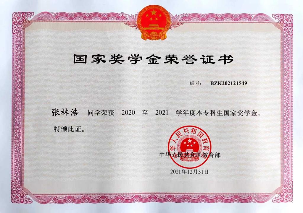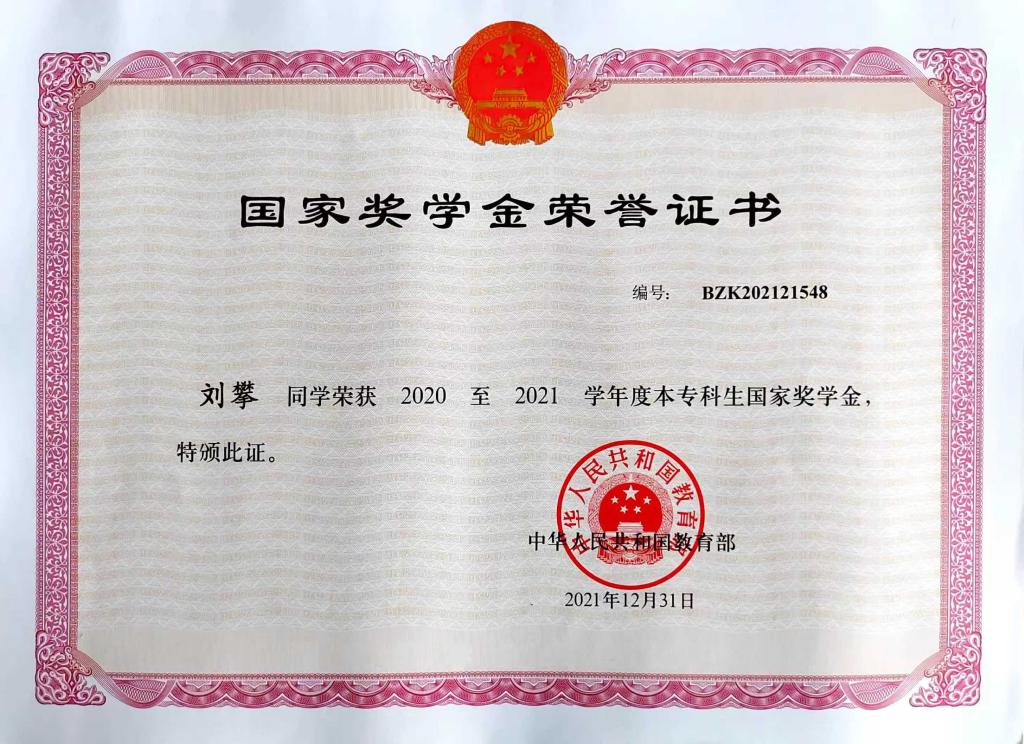 图为国家奖学金证书