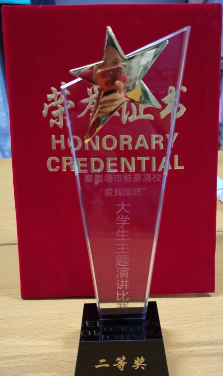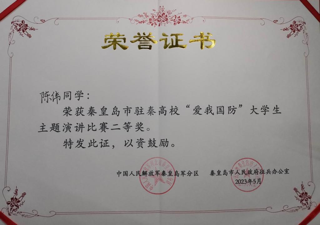 近日,在秦皇岛市驻秦高校“爱我国防”大学生主题演讲比赛中,通过学校初赛选拔的我院退役大学生陈伟同学发挥稳定,获得二等奖。本次比赛为秦皇岛军分区和秦皇岛市人民政府征兵办公室共同主办,共有驻秦11所高校选手参加。(编审:王志安)