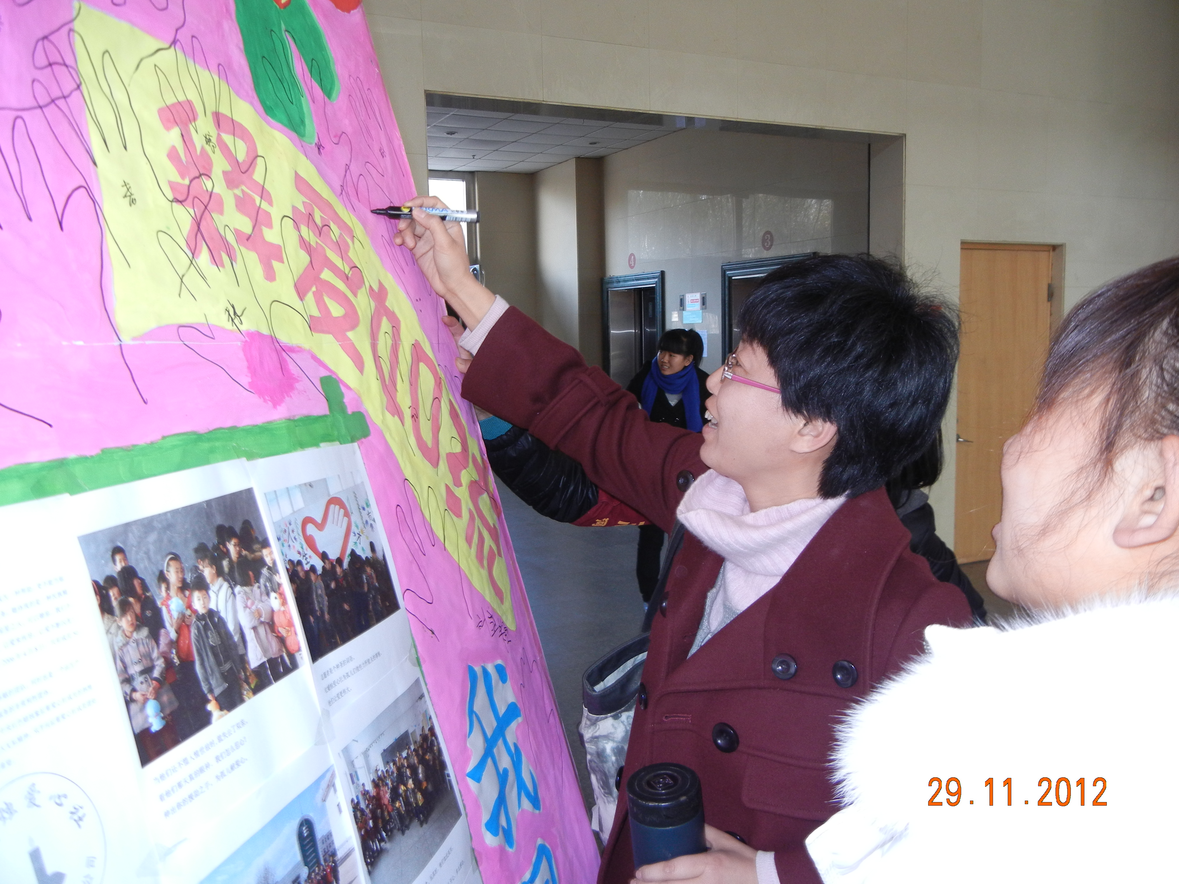 12月6日晚,“视爱如歌”主题晚会在B104举行。学院党委副书记副院长赵维新、学院分团委书记孟颖和志愿者们一起参加了晚会。晚会上,志愿者们首先举行了庄严的宣誓仪式,接着表演了文艺节目。激情炫动的舞蹈,美妙动听的歌曲,幽默感人的小品……一个个精彩的节目吸引着大家的目光,把爱的精神传递,把志愿服务的快乐留在大家的心中。在《让世界充满爱》的手语表演中,晚会落下了帷幕,晚会取得了圆满的成功。