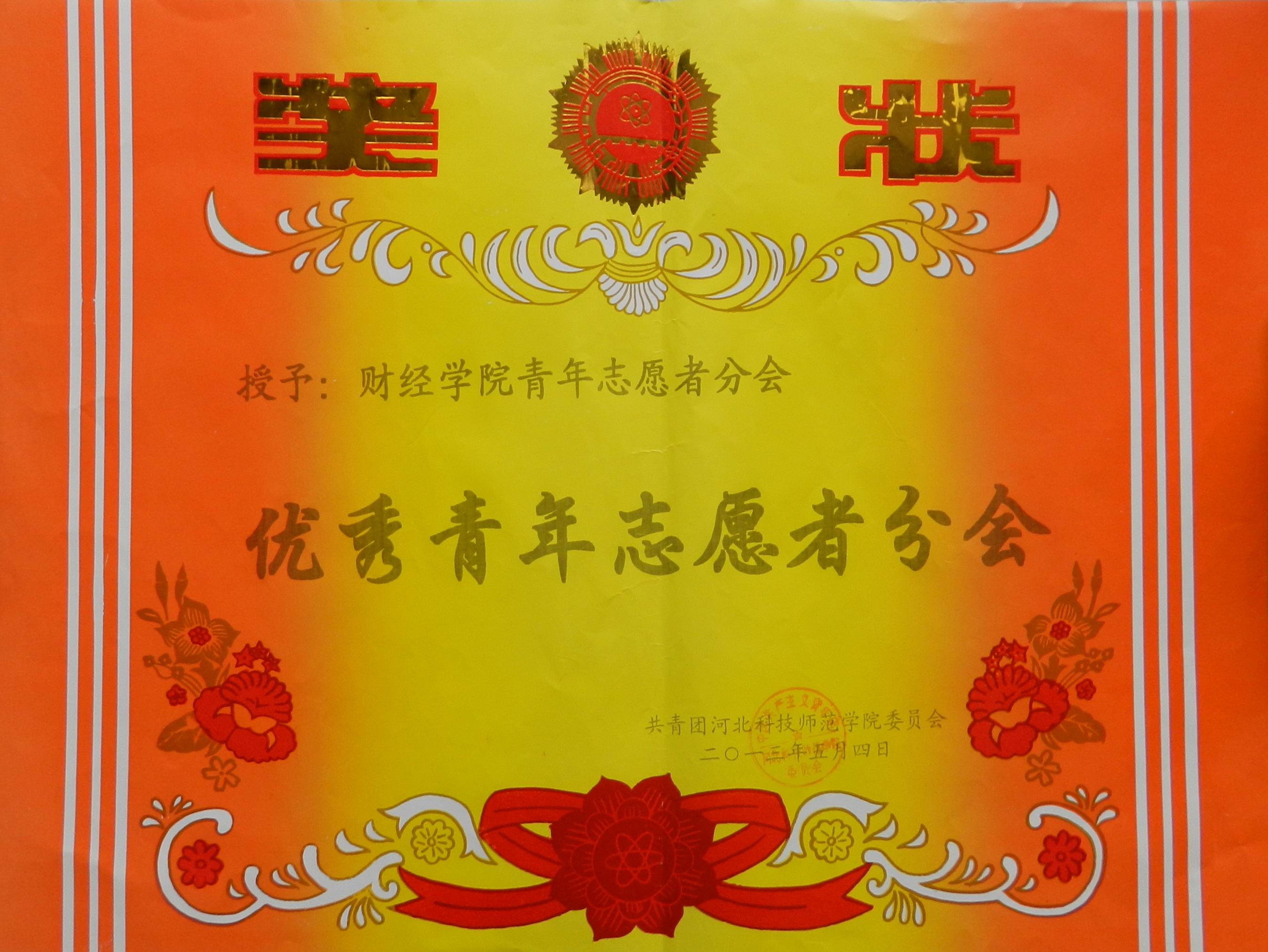 在2013年5月4日校团委五四表彰中,我院青年志愿者分会荣获“优秀青年志愿者分会”称号。