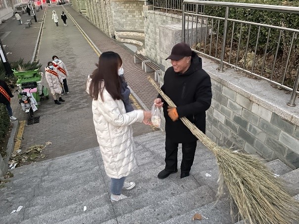 2021年11月27日凌晨六时许,学院青年志愿者协会开展送爱心早餐志愿活动,为冒着低温早起打扫校园的保洁工作者送上温暖营养的早餐。