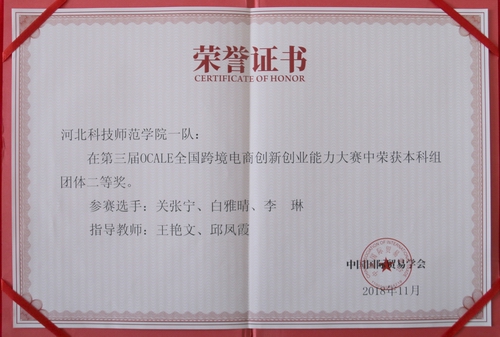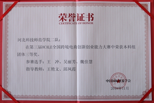 2018年11月5日到2018年11月26日,由商务部中国国际贸易学会主办,中国国际贸易学会培训处、南京世格软件有限责任公司承办,中国(杭州)跨境电子商务综合实验区建设领导小组办公室特别支持的第三届OCALE跨境电商创新创业能力大赛圆满落幕。我院选派的两个团队参加本科组比赛并双双荣获团体二等奖和团体三等奖。