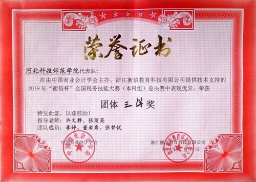 2019年11月13-14日,2019年“衡信杯”全国税务技能大赛总决赛在浙江杭州举行。由财经学子组成的参赛团队获得本科组团体三等奖。
