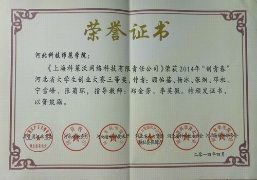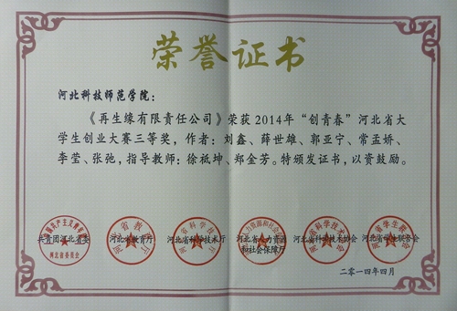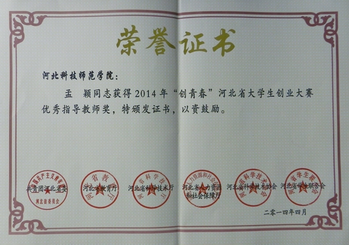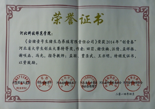日前,在共青团河北省委、河北省教育厅等单位联合举办的2014年“创青春”河北省大学生创业大赛中,我校报送的22件作品中20件作品获奖,我院《金猪壹号生猪生态养殖有限责任公司》作品获特等奖。其他获奖情况是:校学生会《曙光新型农民培训有限责任公司》等3件作品获一等奖,食品科技学院《微生活有限责任公司》等6件作品获二等奖,园艺科技学院《松茂生态园林绿化有限公司》等10件作品获三等奖。我院团委书记孟颖老师获“优秀指导教师”荣誉称号。我校再次被评为“省级优秀组织奖”荣誉称号。