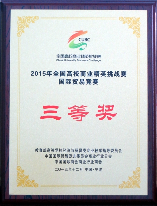 2015年12月4日至6日,由我院学生张岱婧、白炎楠、张岩、杨梦云、付书樵五人组成的代表队在浙江宁波举行的“全国高校商业精英挑战赛暨国际贸易竞赛”决赛中荣获三等奖。指导教师邱凤霞博士和王艳文副教授分别荣获最佳指导教师奖。