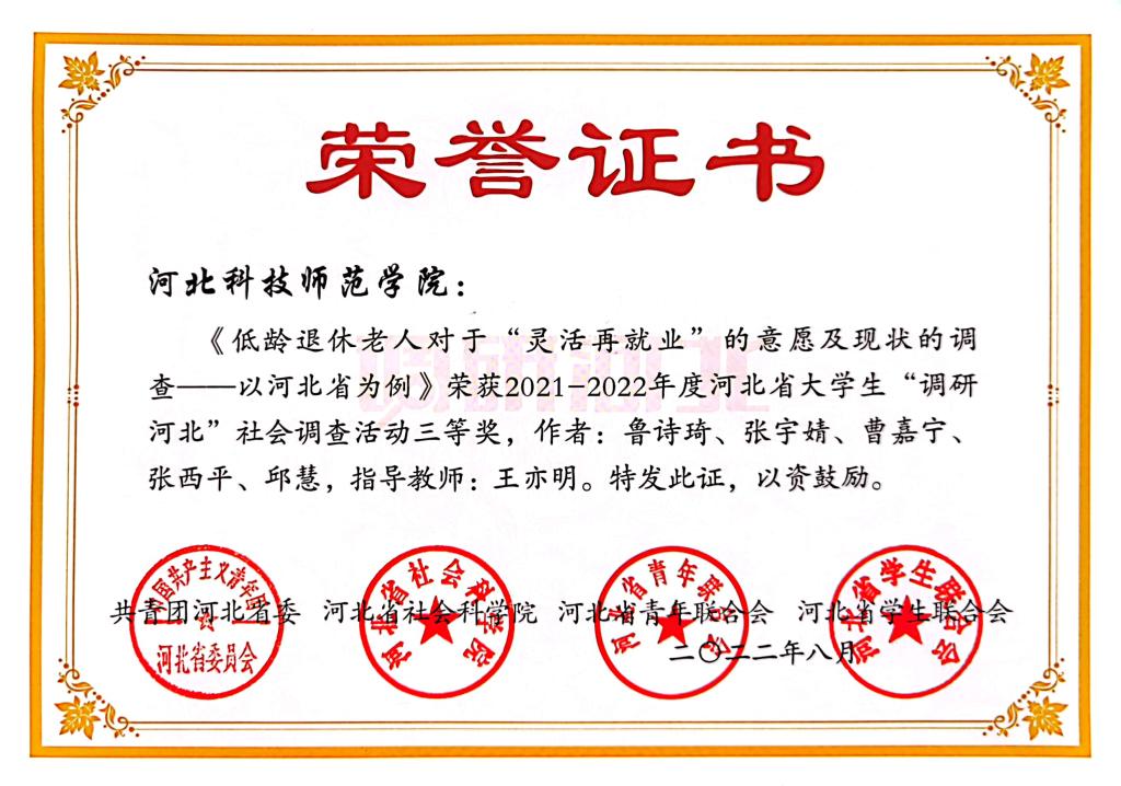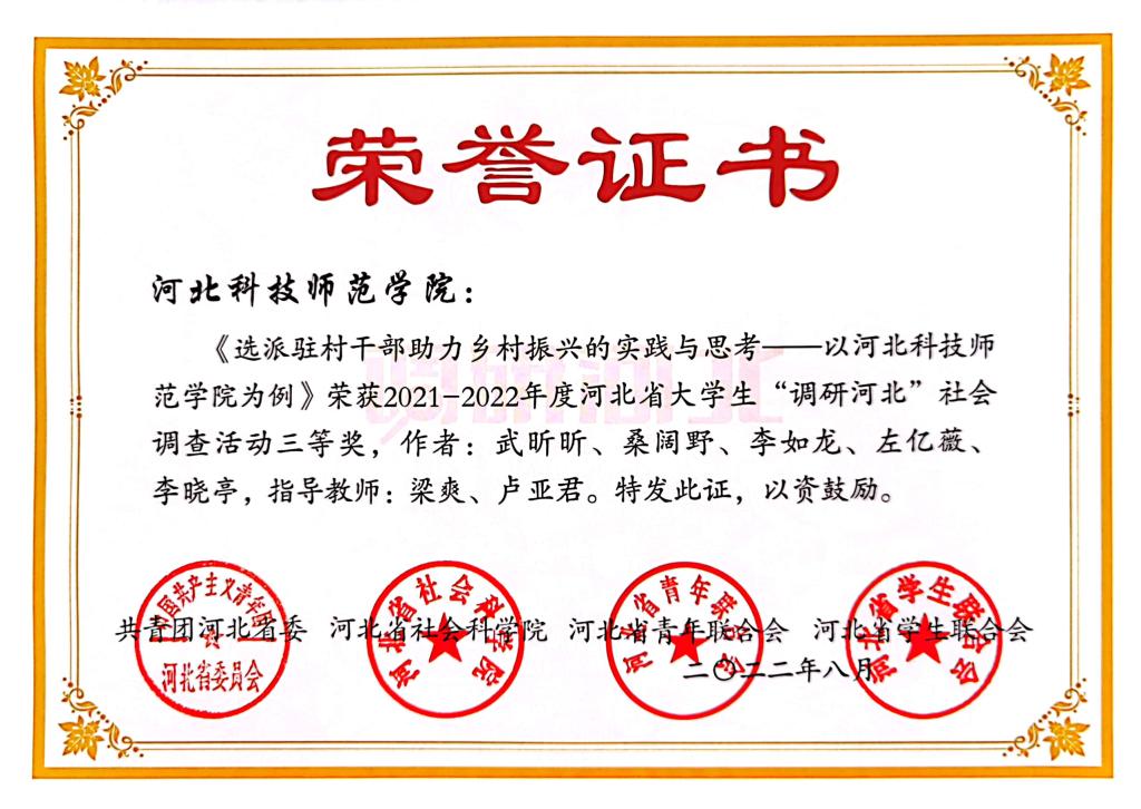 “调研河北”社会调查活动由共青团河北省委、河北省社会科学院、河北省青年联合会、河北省学生联合会共同举办,我院师生在2021-2022年度河北省大学生“调研河北”活动中获得佳绩,获得一等奖一项,二等奖两项,三等奖两项。