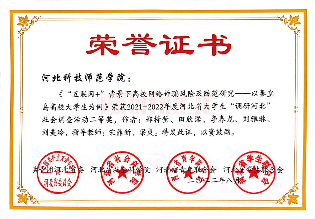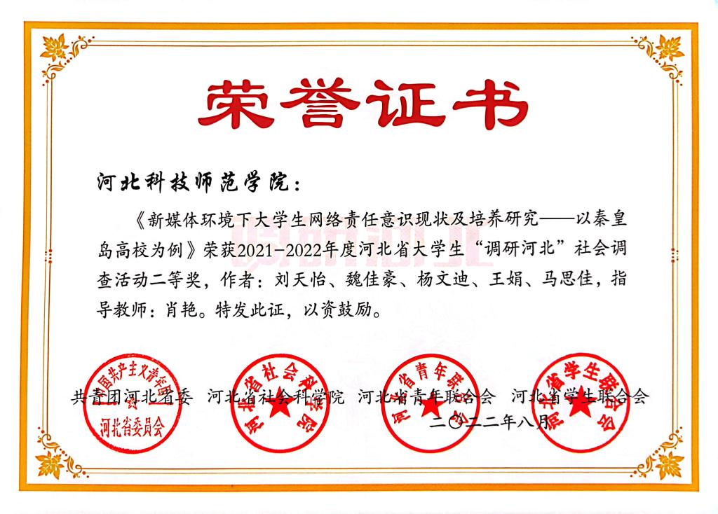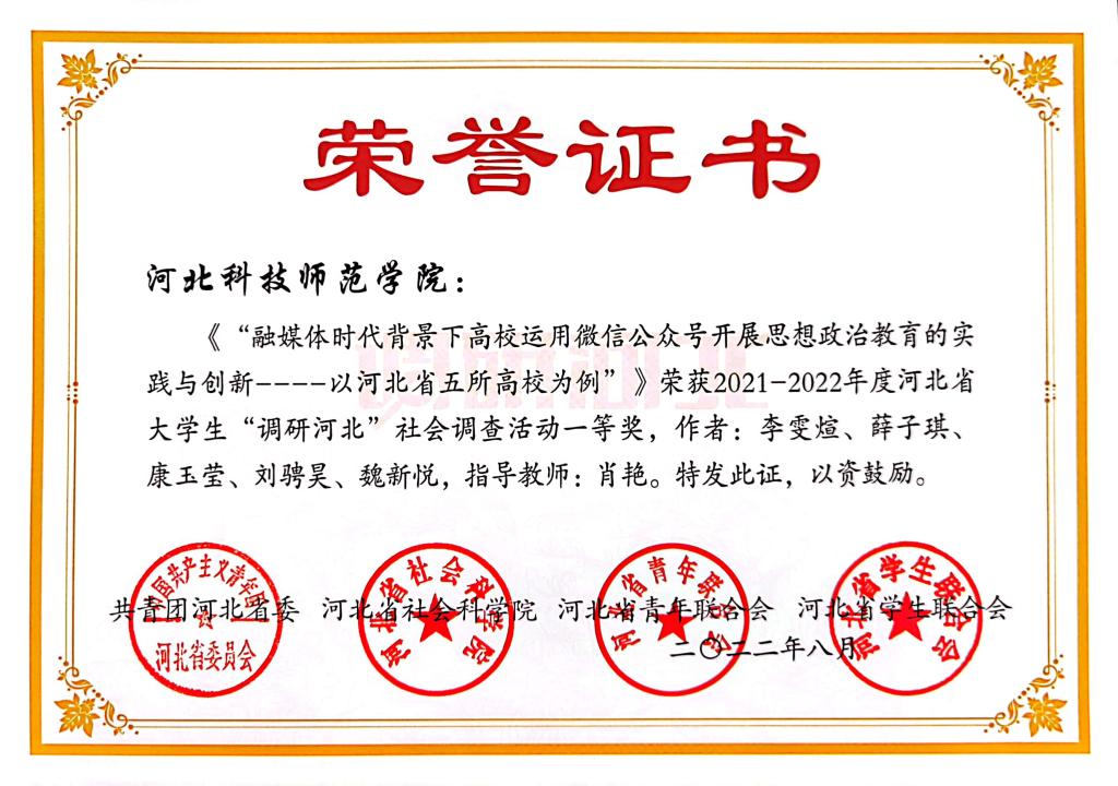 其中李雯煊等的《融媒体时代背景下高校运用微信公众号开展思想政治教育的实践与创新——以河北省五所高校为例》获得一等奖,郑梓莹等的《“互联网+”背景下高校网络诈骗风险及防范研究——以秦皇岛高校大学生为例》获得二等奖,刘天怡等的《新媒体环境下大学生网络责任意识现状及培养研究——以秦皇岛高校为例》获得二等奖,武昕昕等的《选派驻村干部助力乡村振兴的实践与思考——以河北科技师范学院为例》获得三等奖,鲁诗诗等的《低龄退休老实人对于“灵活再就业”的意愿现状的调查——以河北省为例》获得三等奖。(编审:王志安)