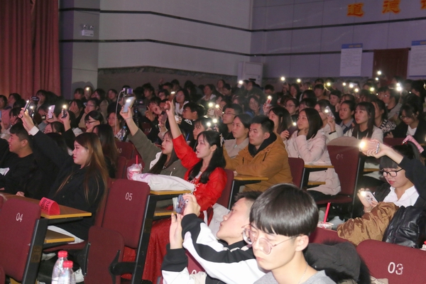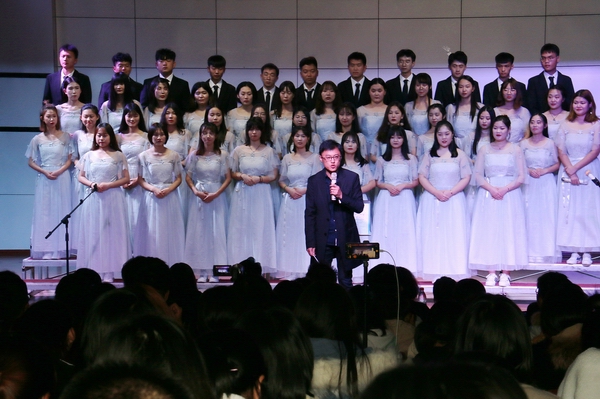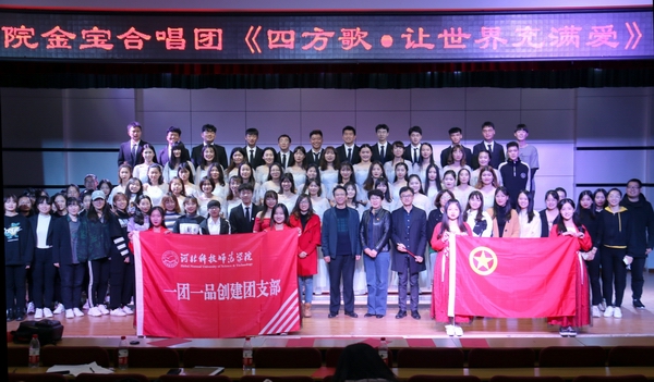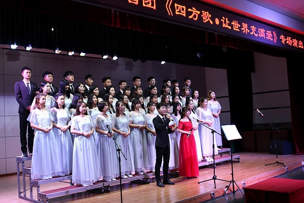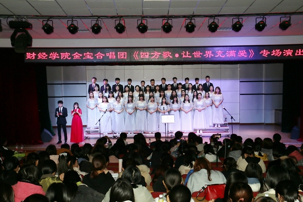 2019年11月8日晚,学院学生金宝合唱团在多功能厅举办专场演出,演出主题是“四方歌·让世界充满爱”。学院党委书记宋文华、党委副书记副院长李宝文和200余名师生一起现场观看演出。金宝合唱团指导教师赵欣担当合唱指挥。