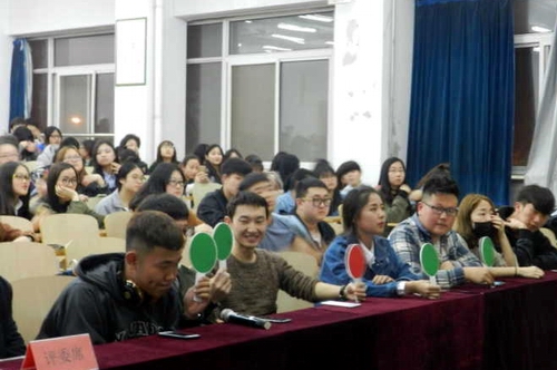 复赛采用选手抽签两两比拼、五位评委举牌的方式来决定胜负,牌子颜色多的一方即为获胜,可直接进入决赛。经过几轮激烈的比拼,孙国庆、袁子悦、张山、屈欣霞、刘晨轩、孟茹飞、李元鹤、禹梅、张焱、赵雨晴十名同学成功晋级决赛。
