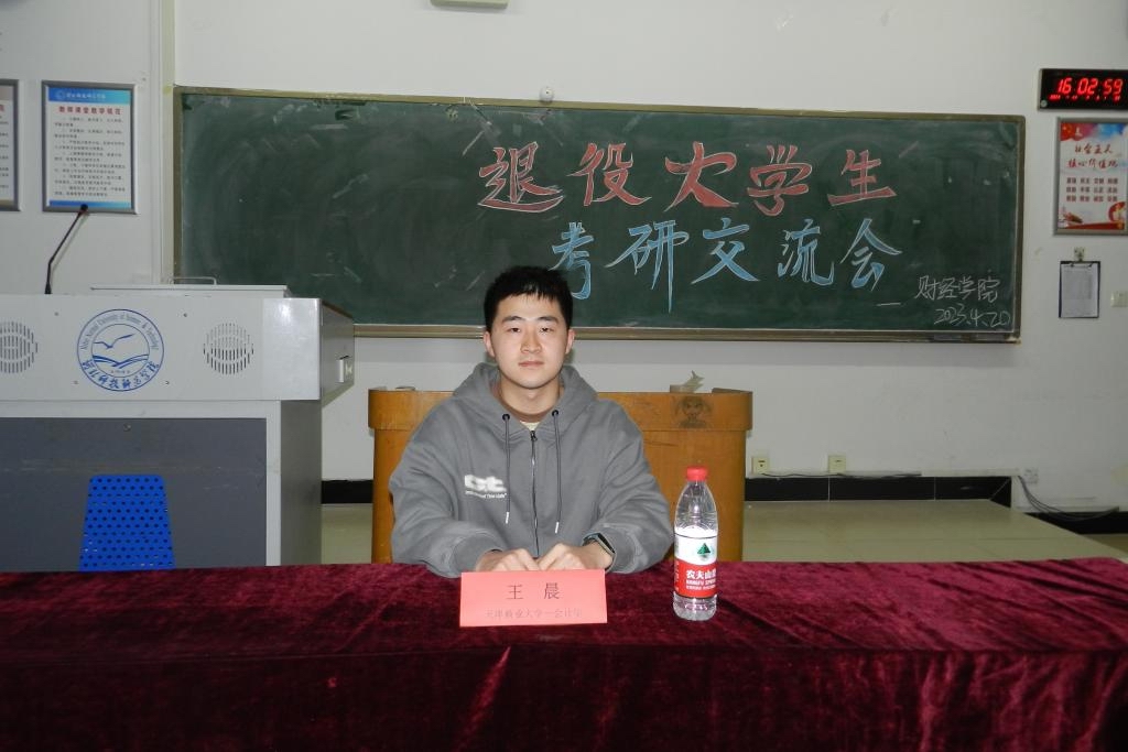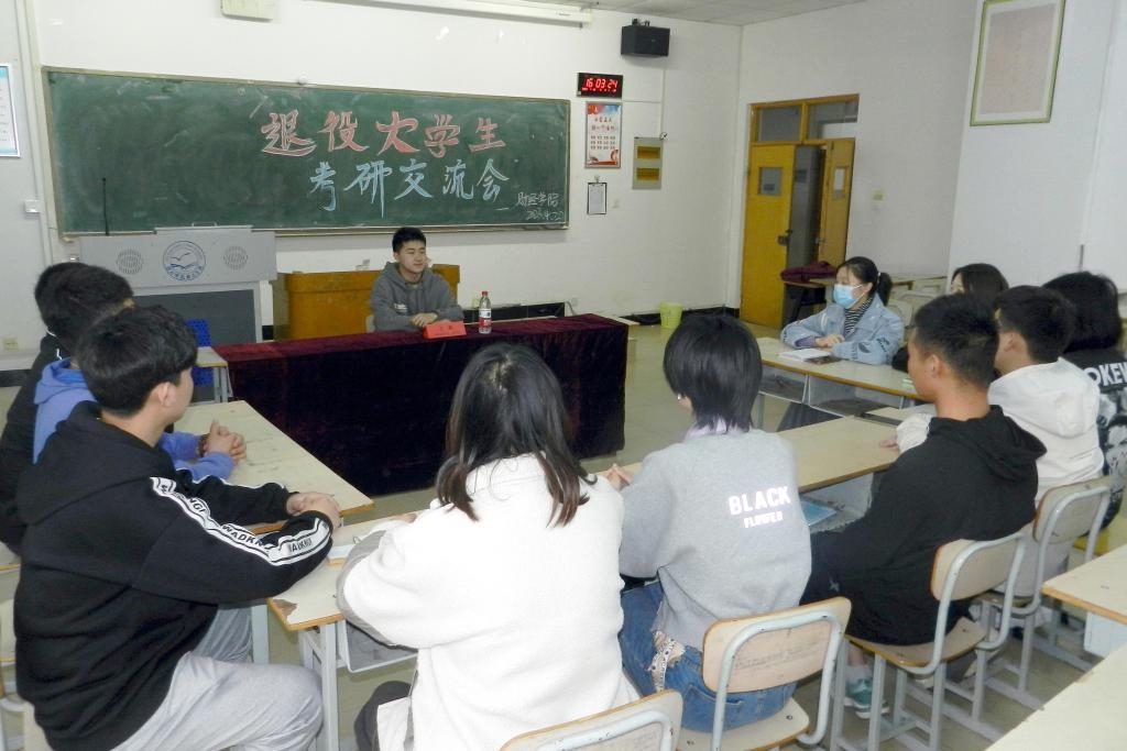 2023年4月20日,学院在逸夫教学楼A501教室召开退役大学生考研交流会。考研成功的退役大学生、2019级财务管理专业王晨同学应邀和10名本院退役大学生交流考研政策、考研经验和心得。