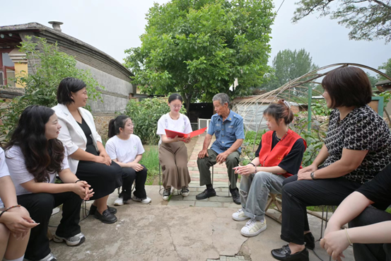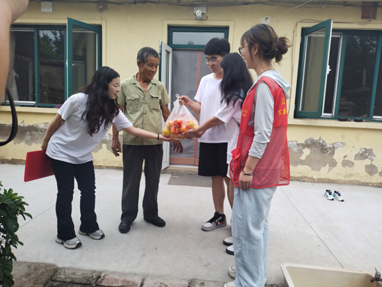 衣食住行不分家,随后在老师和村书记的带领下,团队成员领略了该村第一间民宿的风采,感受古村落的文旅气息。移步换景,他们来到一户老党员的家中,由志愿者像党员同志送上新鲜的桃子,以示敬意。大家围坐一团进行了党纪学习教育理论宣讲,向老党员同志学习致敬。活动中村民为志愿者递来自家种的水果,志愿者向他们表达了感谢。