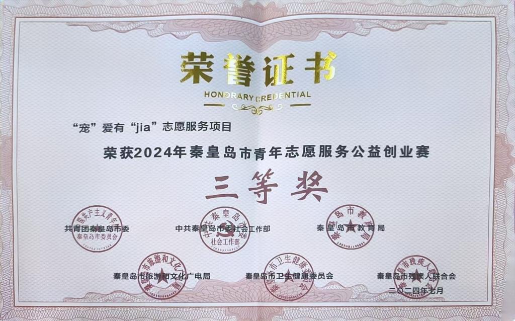 2024 年 9 月 2 日,金沙检测线路js95传来喜讯,其志愿服务“‘宠’爱有jia志愿服务项目”荣获2024年秦皇岛市青年志愿服务公益创业赛三等奖,“晨旭融合幼儿园卫生打扫及衣物捐赠志愿服务项目”荣获2024年秦皇岛市青年志愿服务项目大赛优秀奖。