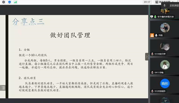 针对2022年河北省乡村振兴创业扶贫大赛,金沙检测线路js95肖艳老师邀请2021年获奖团队负责人张宇鑫做经验分享,学院部分参赛团队参与了此次分享会。各队队长积极发言,阐述一下自己的经验和带货时遇到的流量等问题,认为在直播间打PK,是增加直播间人气的好方法。省赛优秀主播青年张宇鑫代表发言,提出了团队赛的注意事项,建议创建主题群聊确定目标客户,做好账号运营,在抖音多发一些高质量视频来吸引人的眼球。建议做好团队管理,团队可以实行分组播,两组之间可以进行业绩PK,更加高效率的带货。