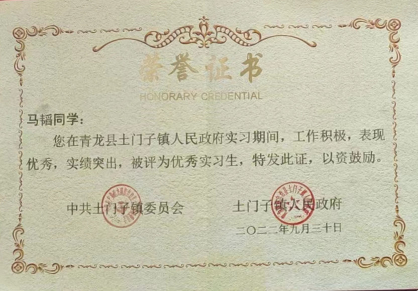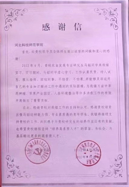 近日,青龙满族自治县县土门子镇向我校发来感谢信,对我院农村发展专业硕士研究生马韬同学表示感谢,对我校支持乡镇基层工作,助力乡村振兴表示诚挚的谢意。