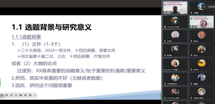 2023年5月8日,学院再次召开23届本科毕业论文专题推进会,传达学校5月6日会议精神,研究部署本科毕业论文下一步工作。5月17日下午4时30分,再次采用线上形式召开了500师生全部参加的2023届本科毕业论文工作推进会议。会上,首先由学院分管副院长徐祗坤安排部署2023届本科毕业论文下一步工作安排,对于论文质量和答辩安排等重点工作做了明确的要求和部署。然后由分管科研的闫文副院长对毕业论文撰写中“第一章绪论”问题,从选题背景研究意义,文献综述,研究目的与内容以及研究方法四个方面做了详细的培训和辅导。