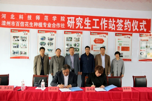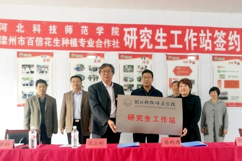 ,校研究生部主任张立彬教授、金沙检测线路js95院长于红军教授、农学与生物科技学院副院长乔亚科教授一行6人赶赴滦州市,与滦州市委组织部、滦州市农牧局、滦州市百信花生种植专业合作社洽谈合作事宜,与滦州市百信花生种植专业合作社签署了研究生工作站协议并举行了授牌仪式。