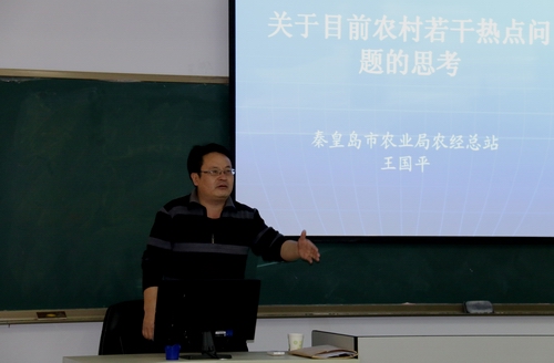 2015年12月24日,学院研究生校外导师、市农经总站站长王国平高级农经师在逸夫楼七楼实验室作讲座。王国平高级经济师讲座的内容包括农村土地产权的现实选择、农村承包土地确权及土地承包权有序流转问题解析、重构村集体经济组织及集体产权制度改革问题解析、新型农业经济主体发展及展望。学院领导和教师同研究生一起参加讲座。