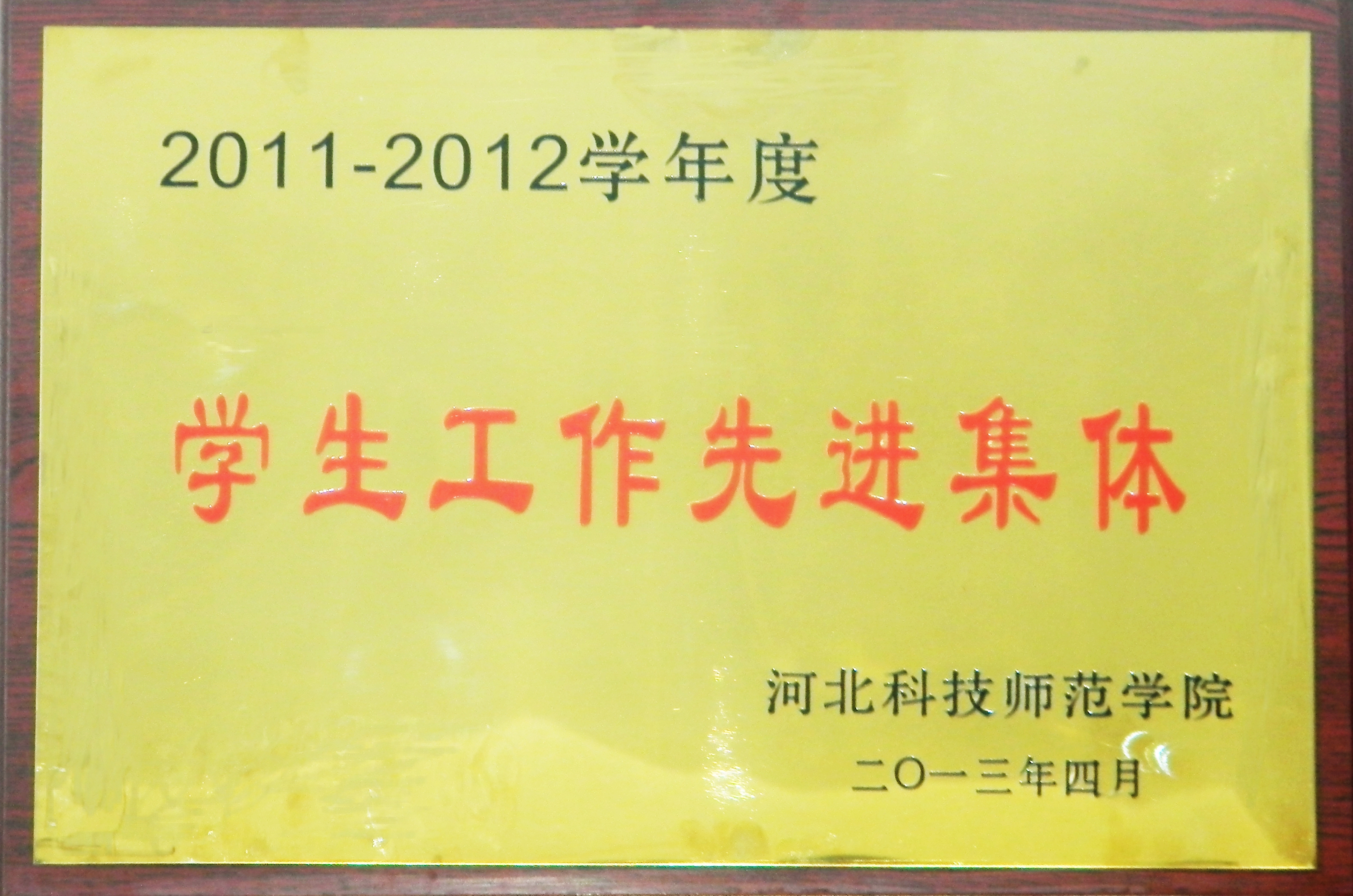 在上级党委政领导的直接指导和全体教职工大力支持下,在学校学生处评比中,荣获2011-2012学年度学生工作先进集体荣誉称号。 图为学生工作先进集体奖牌[详细]