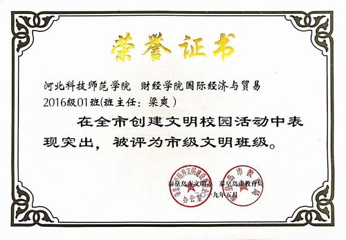 图为国贸1601班省级先进班集体荣誉证书[详细]